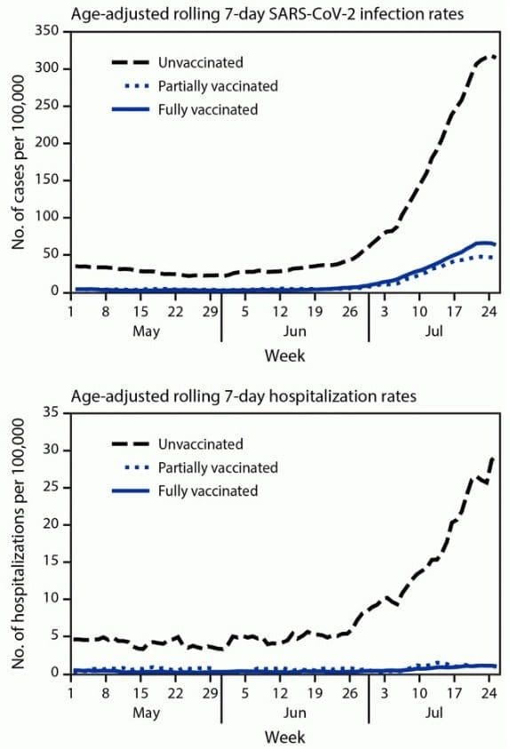 Solo por poner un par de ejemplos: en Francia, entre el 9 y el 15 de agosto, ya en plena ola Delta, el 78% de las muertes y el 79% de las hospitalizaciones fueron entre no vacunados. En Los Ángeles, Estados Unidos, la cosa se ve así.