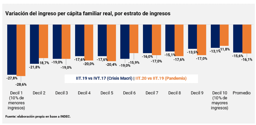 Como se observa, el deterioro del poder adquisitivo es prácticamente idéntico: no es casualidad que la pobreza haya subido casi 10 puntos entre el cuarto trimestre de 2017 y el segundo de 2019 (de un 26% a un 36%), y que haya subido otros once puntos (del 36% al 47%) desde entonces. En promedio, el ingreso real de los hogares se contrajo 15,6% con la crisis del gobierno anterior y 16,1% por el COVID-19. El 10% más pobre fue el más afectado en ambos casos, con caídas casi idénticas (en torno al 28%). Esta mayor afectación del decil más pobre explica por qué la desigualdad subió tanto entre 2017 y 2019 como entre 2019 y 2020.