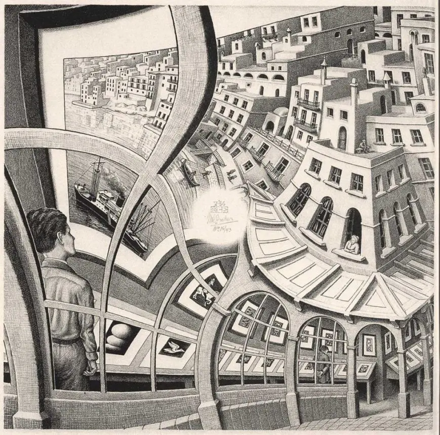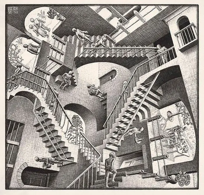 Para ilustrar este recorrido, vamos a apelar a las famosas paradojas visuales de M.C. Escher (1898-1972), un artista holandés especialista en realizar figuras imposibles. Misteriosas, asfixiantes, claustrofóbicas, sus xilografías y litografías transforman y retuercen el espacio de tal manera que nos hacen dudar de cuál es el derecho y cuál el revés de las cosas que dibuja, de qué está abajo y qué está arriba. La gravedad y la comodidad están puestas en duda en estas casas y mansiones que él imagina en blanco y negro, donde nada, por suerte, es solamente lo que parece. Desde chica que veo estas imágenes y pienso en perderme por sus laberintos y corredores, como si pudiéramos comprobar lo imposible transitándolo.