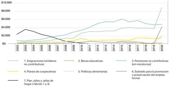 El gráfico a continuación refleja lo anterior. Para su mejor visualización, excluye el gasto destinado a las moratorias previsionales. Como se puede apreciar, durante el doble mandato de Cristina Fernández de Kirchner (2007–2015) hubo una marcada expansión de las asignaciones familiares no contributivas, debido a la creación de la AUH, y de las pensiones no contributivas, explicado fundamentalmente por la moratoria previsional pero también por el notable incremento de las pensiones por invalidez (que pasaron de unas 230.900 en 2007 a 1.065.000 en 2015, es decir que prácticamente se multiplicaron por cinco). En el trabajo citado, dedican una sección completa para desglosar dicho incremento, advirtiendo aumentos muy grandes en algunas provincias como Santiago del Estero, Formosa, Chaco o Misiones, donde no parece corresponderse de acuerdo a su población. Por otro lado, en este período no se observan aumentos significativos en los programas vinculados con los movimientos sociales.