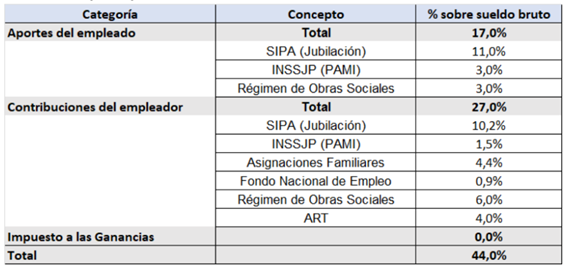 Como se desprende del cuadro a continuación, que sale de este gran trabajo realizado por el Instituto Argentino de Análisis Fiscal (IARAF), la carga total representa el 44% por sobre el salario bruto (la carga del impuesto a las ganancias es nula porque el salario promedio se encuentra por debajo del mínimo no imponible).
