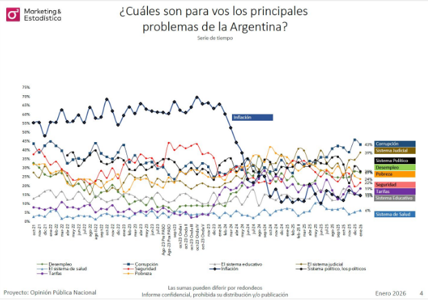 Lopes Perera define otro foco. A diferencia de otros presidentes –la corrupción para Menem, el empleo para Macri, la inflación para AF– Milei no tiene, todavía, un tema único que lo hiera. Eso limita, a su vez, la construcción de una oferta clara de las oposiciones. El tema más mencionado según el estudio de Marketing y Estadísticas es la corrupción, con 47%, pero no está claro el impacto electoral de ese factor. No dañó a Menem y, al menos en 2025, no afectó a Milei a pesar de las denuncias de corrupción, 3% incluido, con discapacidad.