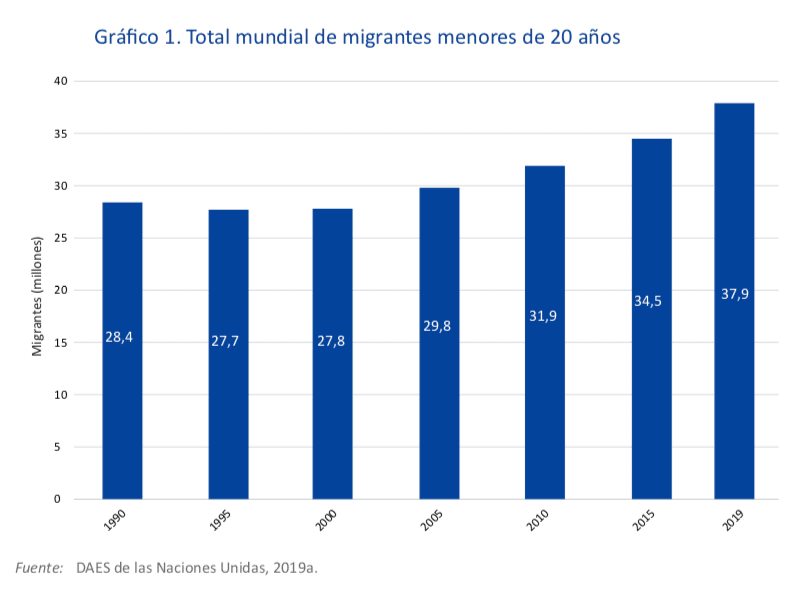 El Informe sobre las Migraciones en el Mundo 2020, publicado por la Organización Internacional para las Migraciones (OIM), en su capítulo enfocado en los menores explica que en 2019 había 37,9 millones de migrantes menores de 20 años, equivalentes al 14% del total de migrantes del mundo.