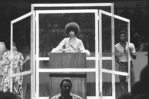 Esta foto de Angela Davis hablando detrás de un vidrio blindado en el Madison Square Garden en 1972. ¿La tenés a Angela? Es filósofa y autora de frases tan hermosas como “Ya no estoy aceptando las cosas que no puedo cambiar. Estoy cambiando las que no puedo aceptar” y de un clásico de clásicos como es el libro Mujeres, raza y clase, que si andás con ganas de entender a qué se refiere el término “estructural” cuando hablamos de “racismo/sexismo/explotación estructural” no podés dejar de leer.