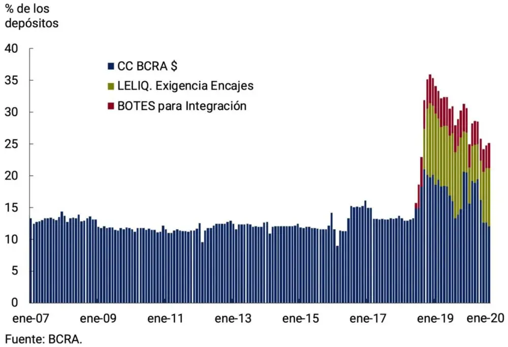 SumatePor ese motivo, en 2018, cuando la gestión de Cambiemos en el marco del acuerdo con el FMI aplicó el plan monetario de “crecimiento cero” de la base monetaria, como parte de las medidas el BCRA fijó un aumento muy fuerte de los encajes, pero a la vez determinó que una parte de los mismos sean utilizados para adquirir bonos públicos o Lelics, como se puede ver en el gráfico a continuación.