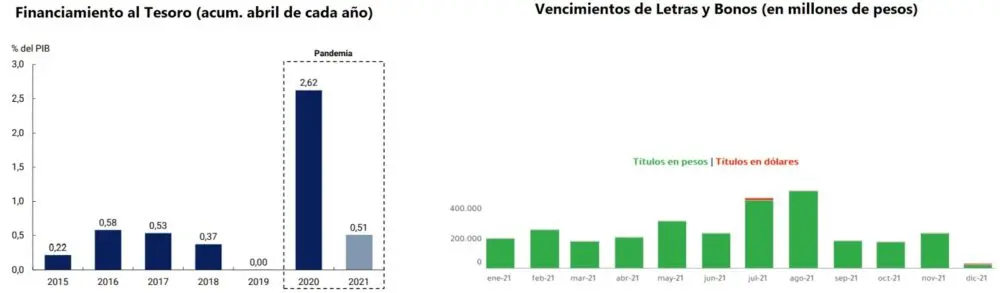Hasta ahora, el gobierno vino logrando ese objetivo (gráfico a la izquierda), pero en julio y agosto se vienen los meses de mayores vencimientos (gráfico a la derecha). Así, la nueva medida abre la posibilidad de que los bancos adquieran deuda pública a partir de junio, generando una potencial demanda adicional para las colocaciones del gobierno. Además, esto llevaría a una reducción del stock de Lelics, que vienen creciendo sostenidamente desde el inicio de la pandemia.
