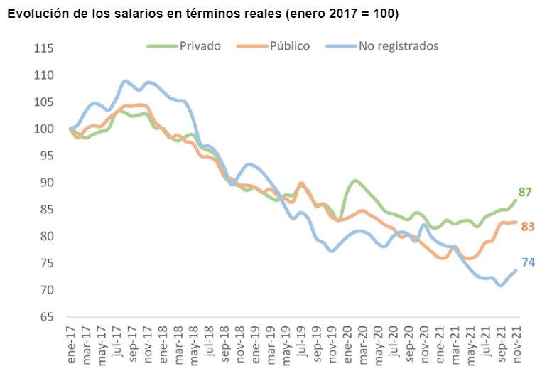 Esto queda claro al ver la comparación en términos anuales: los ingresos del sector público se incrementaron 35,4% y los del sector privado registrado 3,6%, mientras que los del sector privado no registrado se redujeron 10,4%. Asimismo, como muestra el gráfico anterior, al comparar contra principios de 2017, el poder de compra se redujo en promedio un 20%, aunque con una marcada disparidad entre sus componentes.