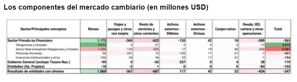 Al analizar en detalle las compras y ventas del mercado cambiario, vemos que el superávit comercial de bienes no alcanzó a financiar el déficit del resto de los componentes (turismo, otros servicios, la FAE y el pago de la deuda), llevando a que el BCRA se desprenda de sus reservas para compensar la diferencia y mantener el tipo de cambio estable.