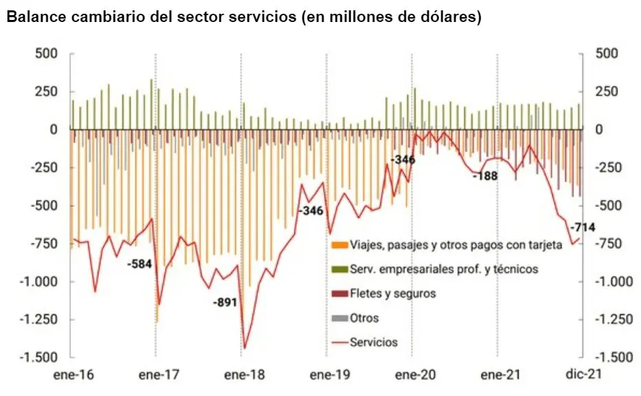 Como destaca el informe, la cuenta “Servicios” registró un déficit de USD 720 millones, mostrando una caída en los egresos netos de 5% con respecto a noviembre. Este resultado fue explicado principalmente por los egresos netos por “Fletes y Seguros” y “Viajes, pasajes y otros pagos con tarjeta” por USD 440 millones y USD 370 millones, respectivamente.