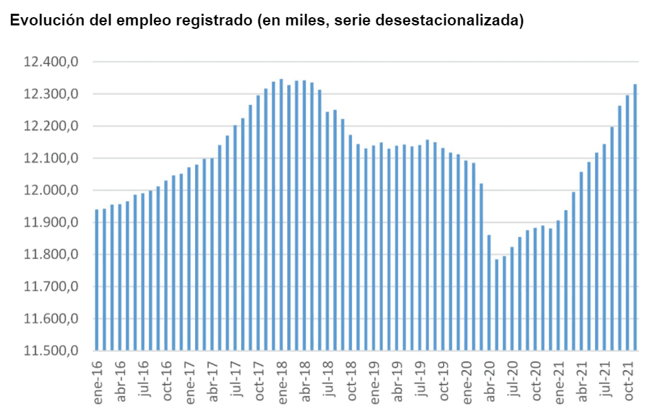 Según los datos del Ministerio de Trabajo, el empleo registrado en noviembre se ubicó en 12.331.000 personas, mostrando un crecimiento de unos 34.300 puestos de trabajo. De esta manera, registra diez meses consecutivos de recuperación y ya prácticamente se ubica en los niveles máximos alcanzados durante la gestión de Cambiemos.