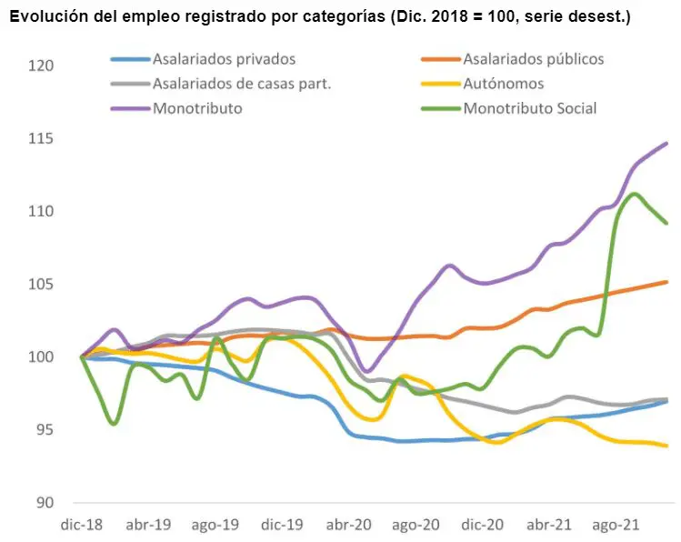 Al desagregar por los tipos de trabajo, el dato más alentador es que la mayoría de esos puestos provinieron del sector privado registrado (+19.300), seguido del monotributo (+11.800) y el empleo público (+7.500), mientras que el empleo en casas particulares se mantuvo prácticamente constante y se observó una caída en los autónomos (-800) y en el monotributo social (-3.800).