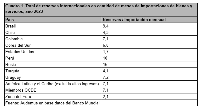 Los países que no emiten una moneda que es reserva de valor internacional, ni emiten activos de bajo riesgo, utilizan la acumulación de reservas como herramienta clave para administrar la volatilidad del tipo de cambio y darle credibilidad a su política cambiaria. En la mayoría de los casos, esta es la razón principal por la cual estos países acumulan reservas aun cuando se trata de activos con un rendimiento real negativo o cercano a cero. En el cuadro 1, se presentan datos de algunos países sobre el total de reservas internacionales en meses de importaciones de bienes y servicios, basado en datos del Banco Mundial para el año 2023.