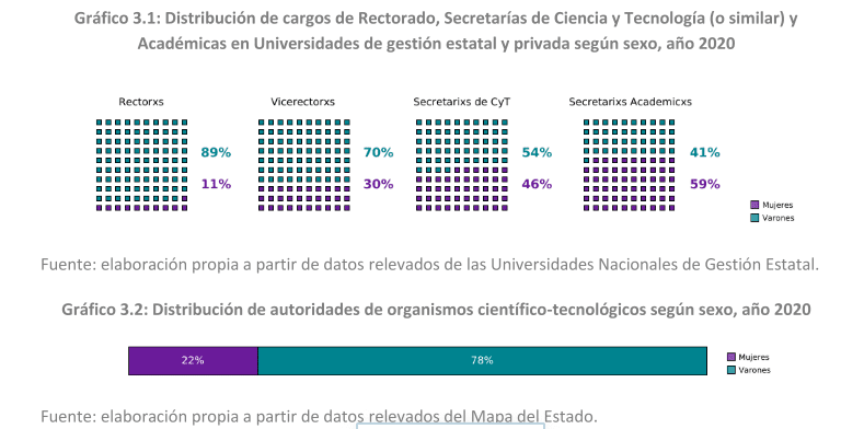 Entre muchos indicadores que dan cuenta del problema que representa la llegada a cargos jerárquicos, se destaca este párrafo: “Las mujeres se encuentran bajo el techo de cristal, ya que solo el 22% de los puestos directivos de los Organismos de ciencia y tecnología son ocupados por ellas. A nivel de política universitaria, es auspiciosa la representatividad mayoritaria de las mujeres en el caso de las secretarías académicas (59%). Asimismo, las secretarías de CYT tienen una representación cercana a la paridad (46%). Sin embargo, la brecha se amplía al enfocarse en puestos de vicerrectoría (30%) y, sobre todo, en los puestos de rectoría donde el número se reduce notoriamente a un 11%, valores que se sostienen similares respecto de años previos. Tal como fuese mencionado en informes anteriores, si bien se destaca la participación de las mujeres en secretarías académicas, no se debe perder de vista que estas áreas son las que mayor carga laboral administrativa representan; además de estar abocadas a la docencia, que como es sabido, ya desde los niveles iniciales es ejercida mayoritariamente por mujeres”.