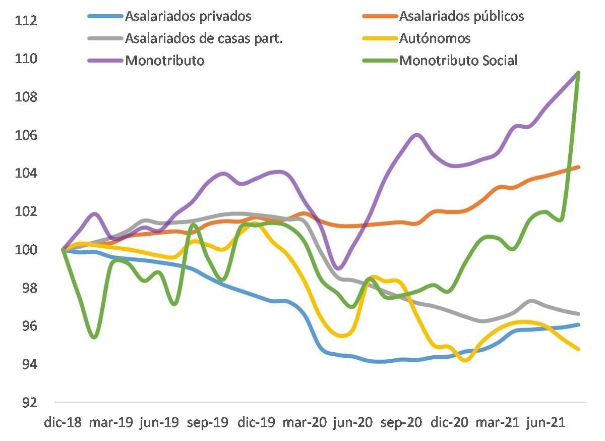 Evolución del empleo registrado por categorías (Dic. 2018 = 100, serie desest.)