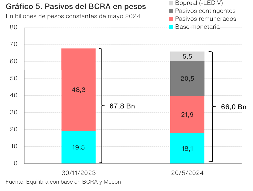 Según Equilibra, el pasivo del Banco Central ascendía a $ 68 billones al 30 de noviembre. Se dividía en dos: $ 19,5 billones de base monetaria (dinero en circulación) y $ 48,3 billones de pasivos remunerados. Al 20 de mayo, ese pasivo cambió de color, pero apenas se redujo a $ 66 billones. A esa fecha, estaba compuesto por $ 18,1 billones de base monetaria, $ 21,9 billones de intereses remunerados, $ 20,5 billones de pasivos contingentes (básicamente, los puts que tienen los bancos a su favor, una opción para revenderles bonos al BCRA) y $ 5,5 billones de Bopreal.