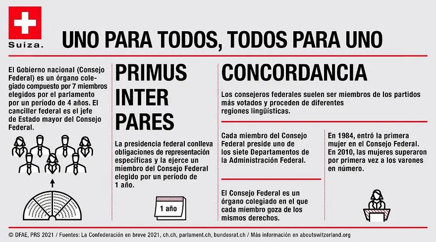 SumateEn cuanto al poder político en su dimensión horizontal, hay un lema general que marca el pulso de toda la política suiza: “Uno para todos, todos para uno”.