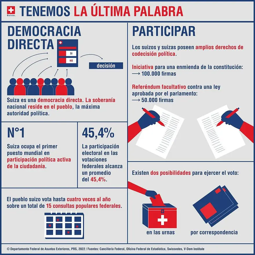 Suiza es una democracia completa. Es representativa porque cuenta con partidos políticos que transmiten valores, dan forma a una ideología o cosmovisión sobre las cosas mundanas, presentan candidatos y candidatas a cargos públicos, y ejercen el gobierno en nombre de quienes los eligen. También es participativa porque, por medio de iniciativas populares y referéndums, esos mismos ciudadanos que eligen a los responsables de tomar las decisiones participan activamente por medio de mecanismos de consulta popular. Y, por último, es en este mismo sentido directa porque, de alguna manera, la consulta a la ciudadanía sobre temas de interés público lleva a su participación en el propio proceso decisorio.