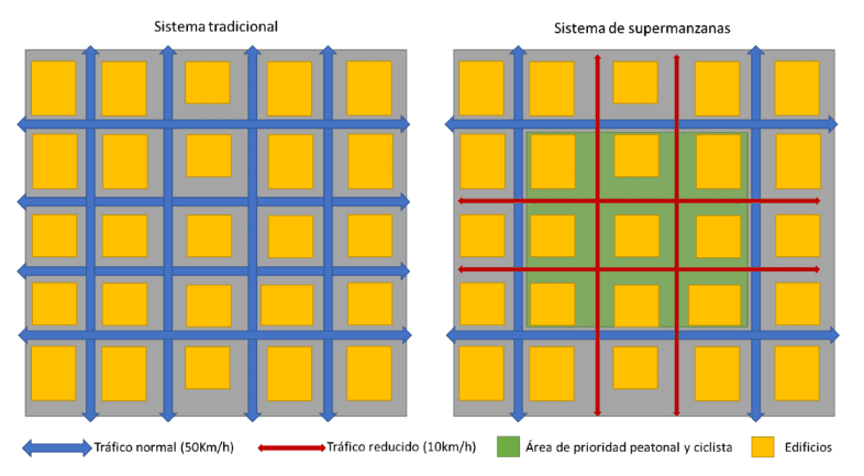 “Se trata de un sistema de jerarquización del tráfico rodado de las ciudades mediante la agrupación de áreas (que engloban varias manzanas) en las que se restringe el tráfico vehicular y se establece una red diferenciada para cada modo de transporte”, explica Borja Castro Lancharro, consultor de la División Transporte del Banco Interamericano de Desarrollo (BID). “De esta manera, el tráfico de paso se desvía a las vías circundantes y sólo se permite el acceso a los vehículos de determinados tipos de usuarios, como residentes, repartidores o la policía”.