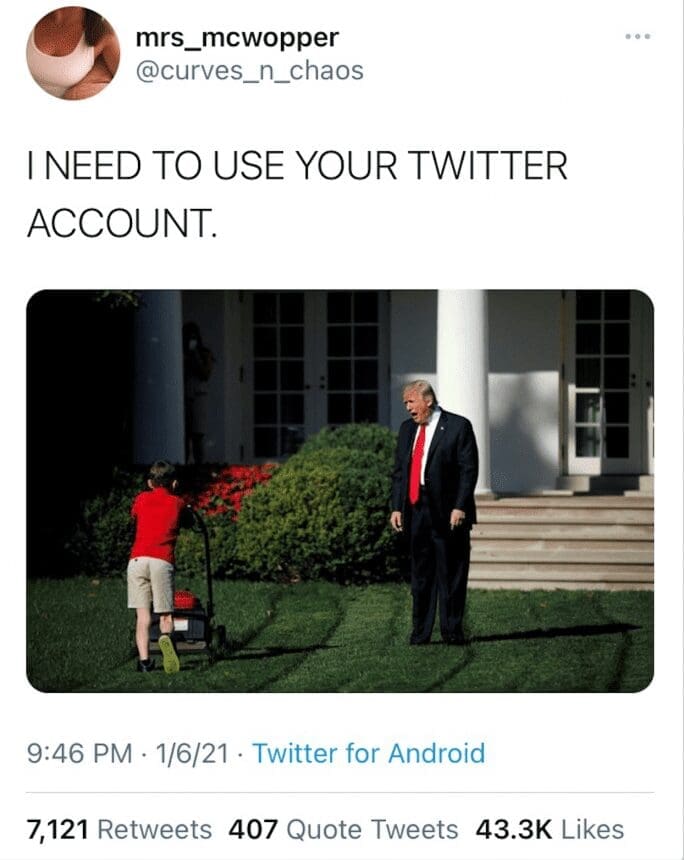 El tuit dice “TENGO QUE USAR TU CUENTA DE TWITTER” y en la foto se ve a Trump gritándole a un niño que está cortando el pasto. Lo cierto es que pasadas las 12 horas Twitter le devolvió la cuenta a Trump y mientras te escribo veo el video que Trump acaba de postear allí –al presi también le cuesta largar el teléfono–.