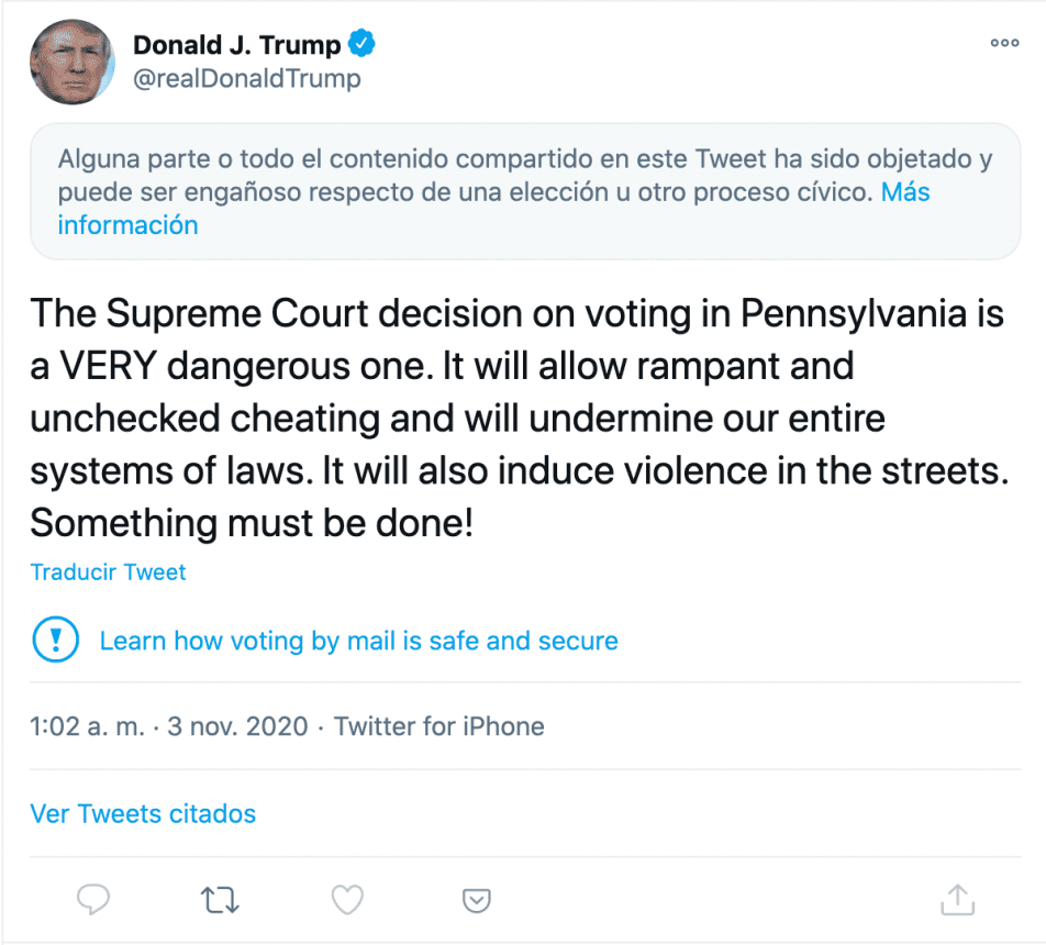 Trump dice: “La decisión de la Corte Suprema en Pennsylvania es MUY peligrosa. Va a permitir hacer trampa generalizada y sin chequear y va a minar nuestro sistema de leyes. También va a generar violencia en las calles. Hay que hacer al respecto!”. Otra vez, Twitter tiene un mensaje para los usuarios: “Descubrí cómo votar por correo es seguro”.