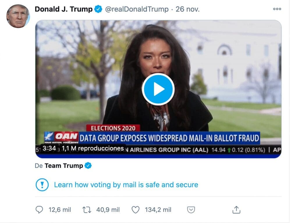 Vamos más atrás. Trump retuitea un segmento televisivo de la cadena One America News que habla de los peligros de votar por correo.
