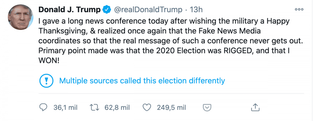 En este tuit Trump cuenta que dio una conferencia de prensa, pero la “prensa fake news” se aseguró de que su mensaje no llegara y nos lo resume: “El punto principal fue que la elección del 2020 estuvo ARREGLADA y que yo GANE”. Twitter tiene algo para decirnos: “Múltiples fuentes indican otros resultados para esta elección”. Si hacemos click veremos otra pantalla que cuenta que Joe Biden ganó.