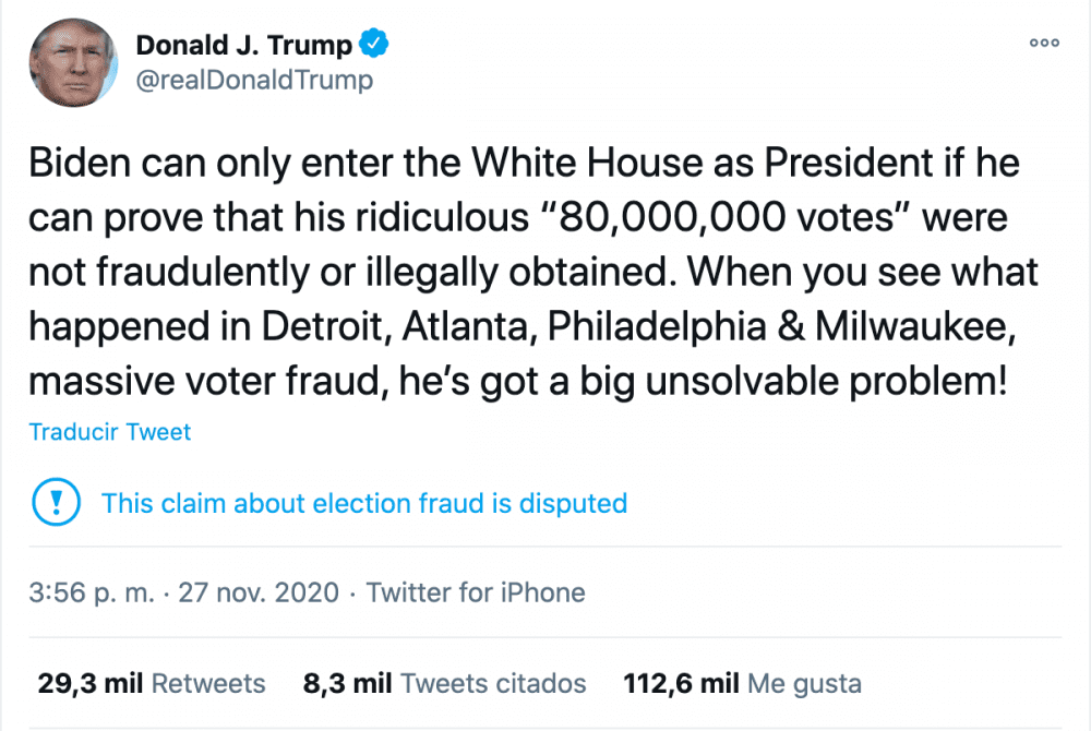 Traduzco lo que Donald escribió: “Biden solo puede entrar a la Casa Blanca si puede probar que sus ridículos ‘80.000.000 votos’ no eran fraudulentos u obtenidos ilegalmente. ¡Cuando ves lo que pasó en Detroit, Atlanta, Philadelphia y Milwaukee, fraude electoral masivo, él tiene un gran problema imposible de resolver!”. El tuit es de hace una hora y acumula 29,3 mil retuits; 8,3 mil tuits citados; y 112,6 mil me gusta. Hasta ahí todo normal. Lo distinto es que Twitter agrega un mensaje en otro color: un signo de exclamación y la frase “Esta afirmación sobre fraude electoral es disputada”. Si uno hace click sobre esa frase va a otra página –todavía en Twitter– donde un texto nos explica que el fraude electoral en Estados Unidos no sucede nunca, y que esto está confirmado por expertos. Más abajo hay links a una cantidad de artículos periodísticos que ofrecen evidencia sobre esto mismo.