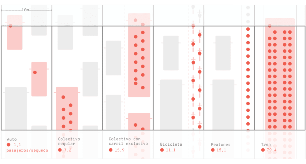 Para Felipe hay tres maneras de mejorar la movilidad y su impacto ambiental: movernos mejor, movernos con menos impacto y movernos menos. “El auto es el principal emisor de GEI en las ciudades, en parte, porque su motor a combustión utiliza combustibles fósiles que emiten estos gases, sí. Pero la razón fundamental es porque utiliza la energía de un modo sumamente ineficiente”, señala. Y la ineficiencia se puede ver en este otro gráfico que te dejo abajo. Mientras que el auto transporta en promedio 1,1 pasajeros por segundo, el tren transporta 79,4. Qué cosa maravillosa el tren. El subte, probablemente esté en cifras similares. Teléfono para Horacio.