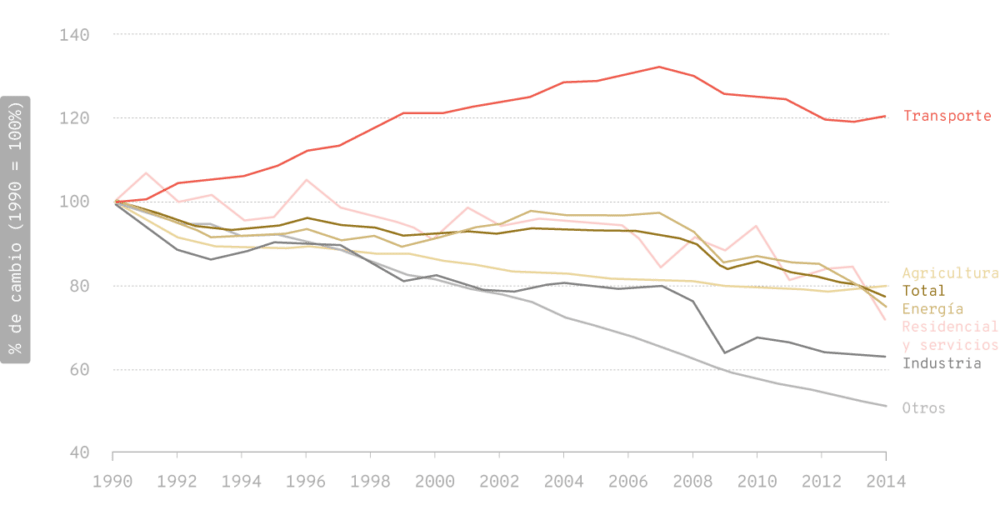 Una de las preguntas que se hace el autor es “¿Cuán significativo es el aporte del sector transporte al calentamiento?”. Y responde que, a nivel global, explica el 16,2% de la emisión de los Gases de Efecto Invernadero (GEI). Sin embargo en países centrales como Estados Unidos, esta cifra se duplica a más del 30% y en nuestro país el sector del transporte contribuye al 14% de esos gases. Pero el dato que más me llamó la atención es que el transporte es el único que no bajó su contribución a los GEI en los últimos años. Mirá este gráfico para Europa: