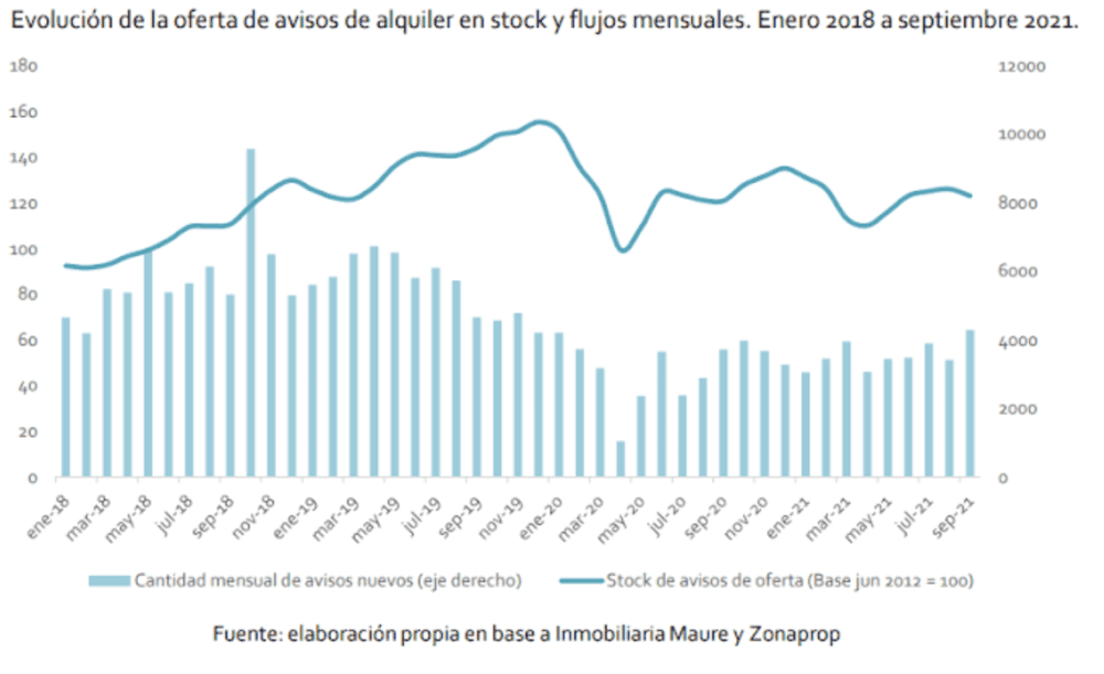 Con respecto a la caída de la oferta, los datos para la Ciudad de Buenos Aires, la que mayor porcentaje de población inquilina tiene, “muestran que la caída de oferta tuvo lugar a fines de 2019 y, especialmente, entre marzo y mayo de 2020 (fase 1 del ASPO). Son todos períodos previos a la sanción de la ley 27.551. De hecho, a partir de junio 2020, cuando se sanciona la ley, la oferta se estabiliza aunque por debajo de los valores prepandemia”.