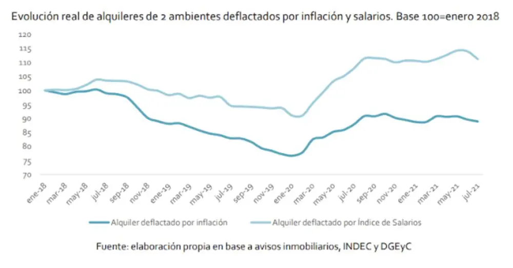 Pero, además, si se tiene en cuenta la situación desde junio de 2018, dos años antes de la sanción de la ley y casi el mismo tiempo que pasó ahora desde su sanción, vemos que el precio en términos reales es significativamente más bajo. Es decir, los alquileres en ese período aumentaron menos que los precios. En cambio, si miramos la línea más clara durante esos meses, vemos que los alquileres aumentaron por encima de los salarios que se licuaron durante la mayor parte del macrismo y durante la pandemia.