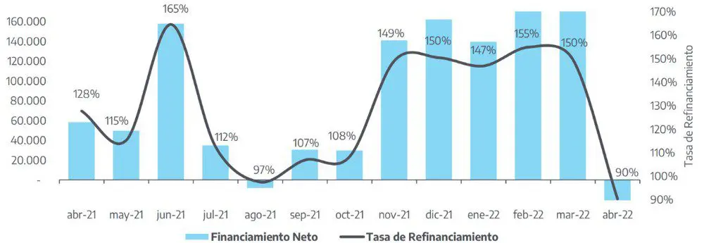Financiamiento neto (en millones de $) y roll over (en % del refinanciamiento)