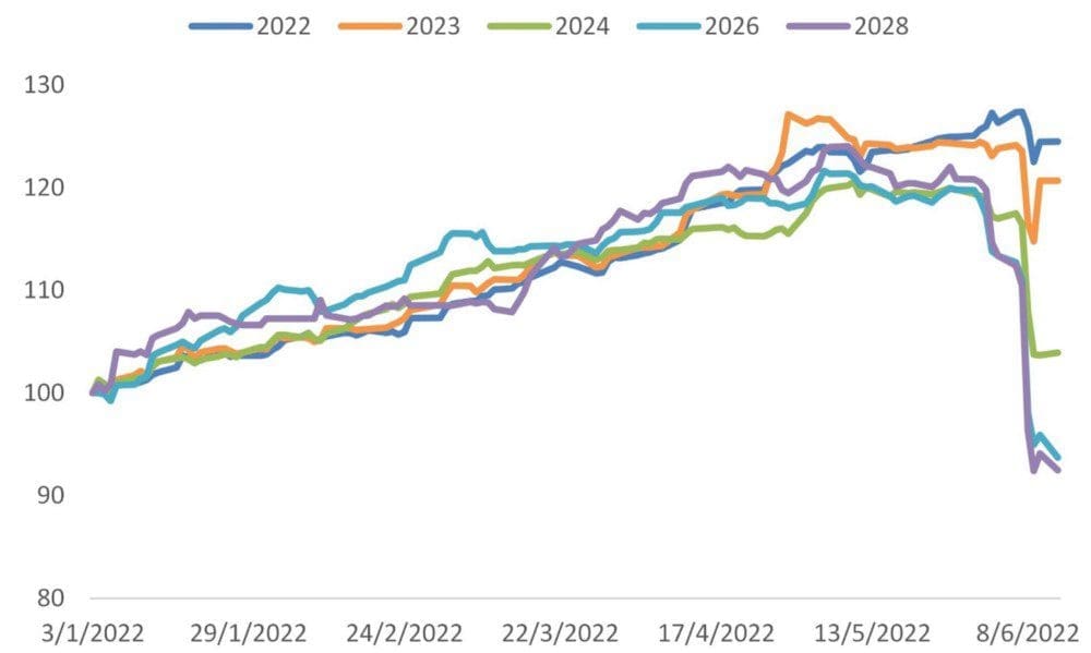 La fuerte caída de los precios refleja una menor demanda por estos títulos, lo cual representa un gran problema para el gobierno, dado que, como vimos anteriormente, esto va a dificultar mucho la capacidad de refinanciamiento, sobre todo para la licitación de fin de mes, donde vencen casi $600.000 millones de deuda (por eso mismo, la que tuvo lugar ayer no es parámetro, dado que vencían solo $11.000 millones). Eso no solo pondría en jaque la situación fiscal, sino también la meta monetaria del acuerdo con el FMI. Así que, a fin de mes, el gobierno se va a enfrentar a uno de los desafíos más grandes en materia fiscal del 2022. Veremos qué pasa.