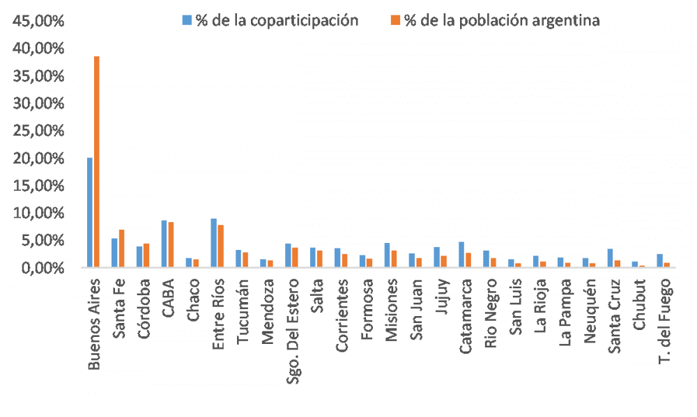 Por otro lado, existe bastante consenso en que la provincia de Buenos Aires es la más perjudicada en cuanto a la distribución de los recursos por la coparticipación. Una de las maneras más sencillas de corroborarlo es comparando el porcentaje de los recursos totales que le corresponde a cada provincia por la coparticipación y la población que cada una tiene (se supone que cuanto más elevada la cantidad de habitantes, mayor es el gasto que cada provincia debe realizar, ya que su principal función es proveer servicios públicos a dichas personas).