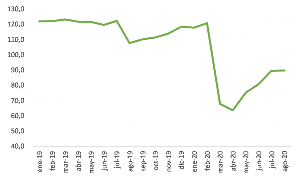 Ventas minoristas: A partir de la encuesta elaborada por CAME, en agosto las ventas minoristas (medidas en cantidades) a nivel país se redujeron 18% en relación al mismo mes del año anterior. Pero mientras que en la región AMBA la retracción fue del -33%, en el resto del país fue de -9%, reflejando las diferentes situaciones sanitarias. En agosto la recuperación se frenó y muestra el mismo comportamiento en forma de “√” invertida que mencionamos para la industria en la edición anterior, ubicándose un 25% por debajo de los niveles pre-pandemia.