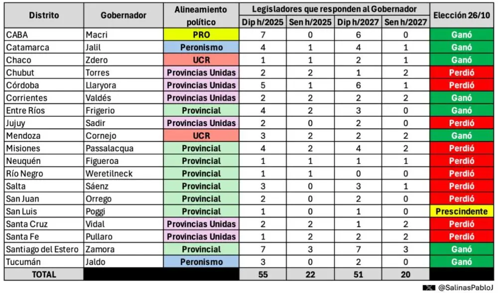 Se puede cuantificar el peso legislativo del Pacto de Mayo y, según un relevamiento que hizo el consultor Pablo Salinas, la cantidad de diputados y senadores que aportan los gobernadores dadores de gobernabilidad, se reducirá a partir del recambio legislativo. Algunos, como Alberto Weretilneck de Río Negro, se quedarán sin delegados (ni diputados ni senadores). La cuenta general –incluyendo a Zamora, Jaldo y Jalil– refleja que hay una pérdida de poder legislativo de los gobernadores.