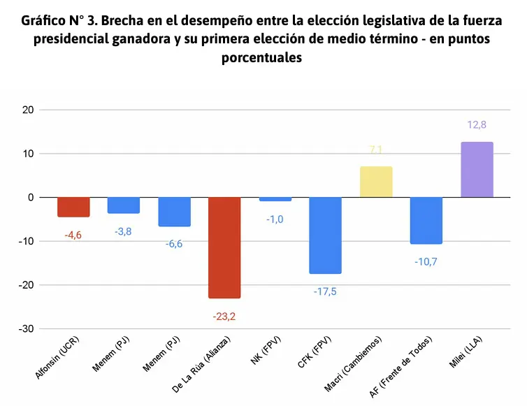El desempeño de LLA, al igual que el peronismo en 1993, fue el mayor en cantidad de bancas ganadas en una elección desde la vuelta de la democracia y fue similar al de Cambiemos en 2017. El gobierno de Javier Milei —que comenzó su mandato con su principal flanco débil en la representación parlamentaria— consiguió un escudo legislativo de un tercio para bloquear leyes y sostener vetos y una potencial espada parlamentaria para avanzar con su programa de reformas: LLA pasó de 37 a 80 bancas propias y, de sostener su coalición con el macrismo (24), tendría una primera minoría para impulsar reformas.