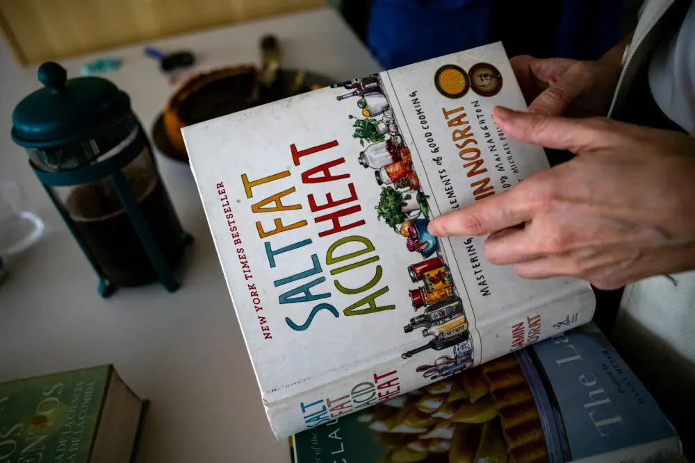 Sí, en un momento compraba estos libros sin parar. Tengo cientos de libros de cocina porque era mi obsesión antes de tener hijos, cuando una le dedica todo el tiempo, la energía y el dinero que tiene a lo que le gusta. Y los usaba un montón. Entre mis favoritos también están los de Alice Waters, la Dolli Irigoyen de Estados Unidos. Es la cocinera que abrió el restaurante Chez Panisse de San Francisco, que es lo más. Este otro libro sufrió un accidente, se me mojó. Se llama Salt Fat Acid Heat de Samin Nostrat. Ella tiene una serie en Netflix que se llama igual que el libro. Lo que tiene de hermoso es que está lleno de técnicas de cocina. Tiene algunas recetas, pero lo más claro son otras cosas: cómo se hace una emulsión, por ejemplo. Y tiene un montón de ilustraciones. En general, los libros de cocina que más me gustan no tienen muchas fotos.