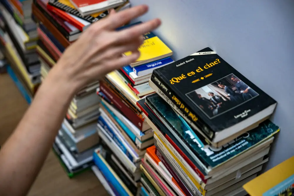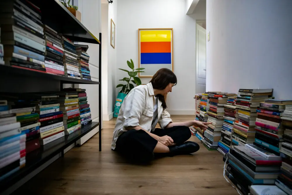 Ximena nos invita ahora a subir a la primera planta de su casa, donde están el resto de los libros. Los tiene apilados a ambos lados de un pasillo porque se mudó hace relativamente poco, y todavía no consiguió disponerlos de otra forma. “Tuve épocas de ordenar por autor, de ordenar por color. Ahora desde que me mudé está todo mezclado: soy madre, no tengo tiempo para nada. Yo inconscientemente sé donde están, pero no hay una lógica”, aclara. Así que pasamos a examinar los volúmenes a medida que los va encontrando y señalando.