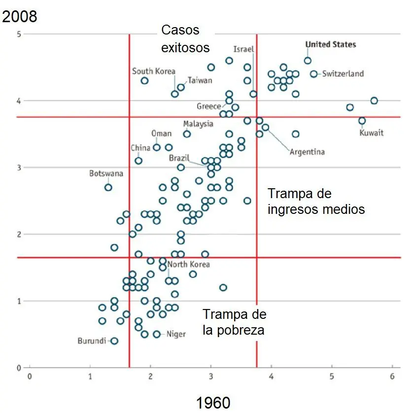 Te habrás dado cuenta de que esta hipótesis encaja bastante bien para el caso argentino, es más, si prestaste atención al gráfico, ahí figura señalado como uno de los países dentro de la trampa de los ingresos medios (con prácticamente la misma posición en 1960 que en 2008).