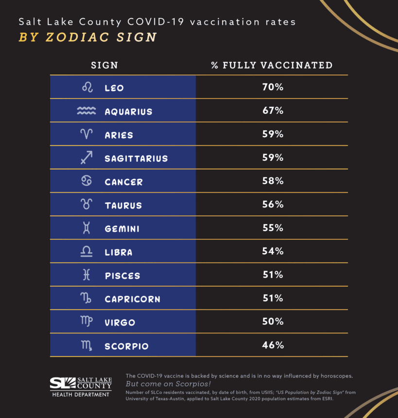 La noticia: el Departamento de Salud del Condado de Salt Lake City en Estados Unidos publicó datos de vacunación en función del signo zodiacal de las personas. En el siguiente gráfico (hoy es el día de los gráficos) se puede ver, por un lado, el signo y, por otro, el porcentaje de personas con esquema completo sobre el total estimado de habitantes del condado de ese mismo signo.