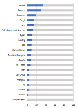 - Todas las empresas obtuvieron una puntuación baja, la más alta fue para Nestlé (34,6%) y la más baja para Groupe Brigard (0%), el mayor procesador europeo de carne vacuna.