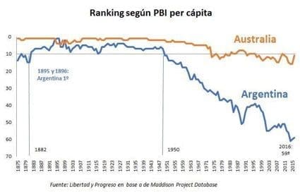 Tal como se ve, el gráfico -elaborado por la fundación «Libertad y Progreso», think tank ultraliberal (durante mucho tiempo Espert tuvo uno igual en su foto de portada de Twitter) – muestra la posición de Argentina en el ranking mundial del PBI per cápita desde 1875 hasta la actualidad. El gráfico también muestra a Australia, país que se toma habitualmente de referencia en la comparación con Argentina, debido a que hacia 1900 eran países de alto ingreso per cápita para los estándares mundiales, muy baja densidad demográfica y clima mayormente templado. Una primera lectura del gráfico, en la que se ve que Argentina pasa del top ten de PBI per cápita entre 1882-1950 al puesto 59 en 2016, es la siguiente: «no fuimos Australia por culpa del peronismo». Aún más, el gráfico muestra que en 1895 Argentina fue el país de mayor ingreso per cápita del mundo, reforzando la idea de un pasado dorado que en algún momento se perdió. Esta idea nostálgica de un pasado próspero que el «estatismo intervencionista populista peronista» vino a romper es ciertamente muy atractiva como relato de la historia argentina.