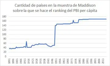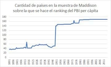 Por un lado, la muestra de países de la base cambia a lo largo de la historia. Como puede verse en el Gráfico 2, la base de Maddison tenía unos 45 países en los años ’40, y pega un salto brutal en 1950, a más de 140. ¿A qué se debe esto? Básicamente a que a partir de entonces mejora mucho la calidad informativa de las estadísticas nacionales, sumado a que en los años de posguerra surgen muchos países nuevos (piénsese por ejemplo en las ex colonias africanas o asiáticas).