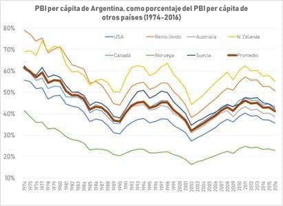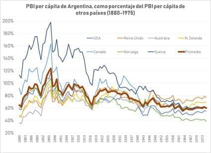 [1] La tasa de crecimiento del PBI per cápita entre 1944-46 y 1973-75 fue del 2% anual en Argentina, 1,8% en Estados Unidos y Reino Unido, 2% en Nueva Zelanda y 2,2% en Australia. En comparación, fue del 4,1% en Europa Occidental, del 1,0% en Chile, del 1,4% en Uruguay, del 3,3% en México y del 4,4% en Brasil.