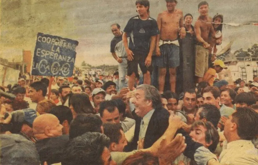 SumateVemos a un Kirchner totalmente metido entre la gente, que casi lo cubre. Al fondo, un canal de televisión (esta foto fue portada del diario Clarín al día siguiente; podemos recordar un tiempo en el que Clarín no había roto lanzas con el kirchnerismo). De fondo hay un contexto de pobreza, pero en realidad lo que vemos primariamente es la cercanía, la emoción. Lo que vemos en esa foto es esperanza.